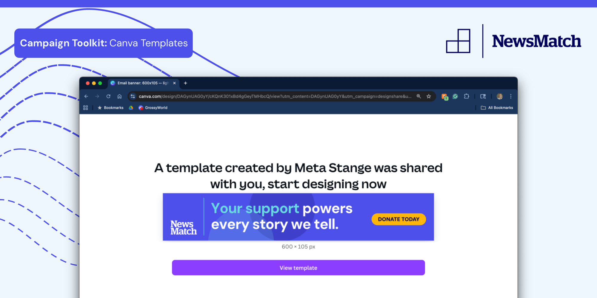 Canva is a graphic design platform, used to create social media graphics, presentations, posters, documents, and other visual content. You can use NewsMatch templates on this platform to customize your graphics and messaging.