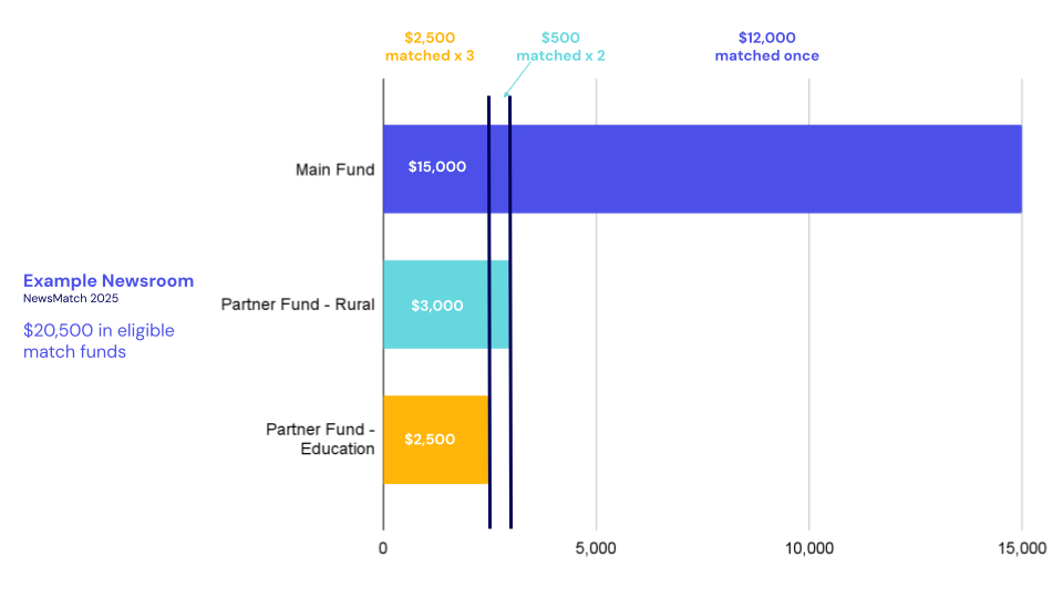If you’re eligible for $15,000 from the main fund, $3,000 from the rural partner fund, and $2,500 from the education partner fund, you only need to raise $15,000 in eligible donations to unlock all $20,500 in match funds.