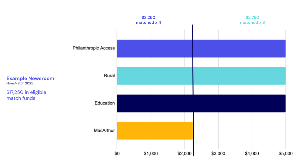 If you’re eligible for $5,000 from the rural fund, $5,000 from the philanthropic access fund, $5,000 from the education fund, and $2,250 from a regional partner fund, you only need to raise $5,000 in eligible donations to unlock $17,250 in match funds.
